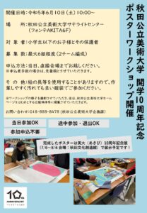 (ワークショップで作成したポスターは、7月6日から開催される美大10周年記念展会場の秋田市文化創造館で展示を予定しています。)