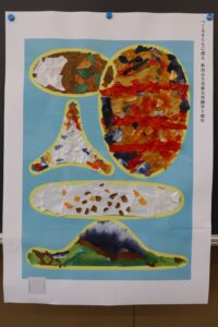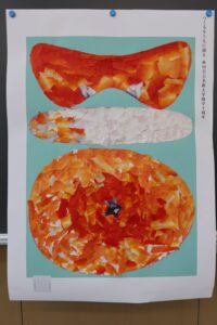 生徒の皆さんは、ポスターに描かれたモチーフの説明を受けた後、2つのチームに分かれて和紙を切り貼りし、制作しました。友達同士でモチーフに対するイメージを出し合い、それぞれのチームで協力しながら制作を進めていきました。