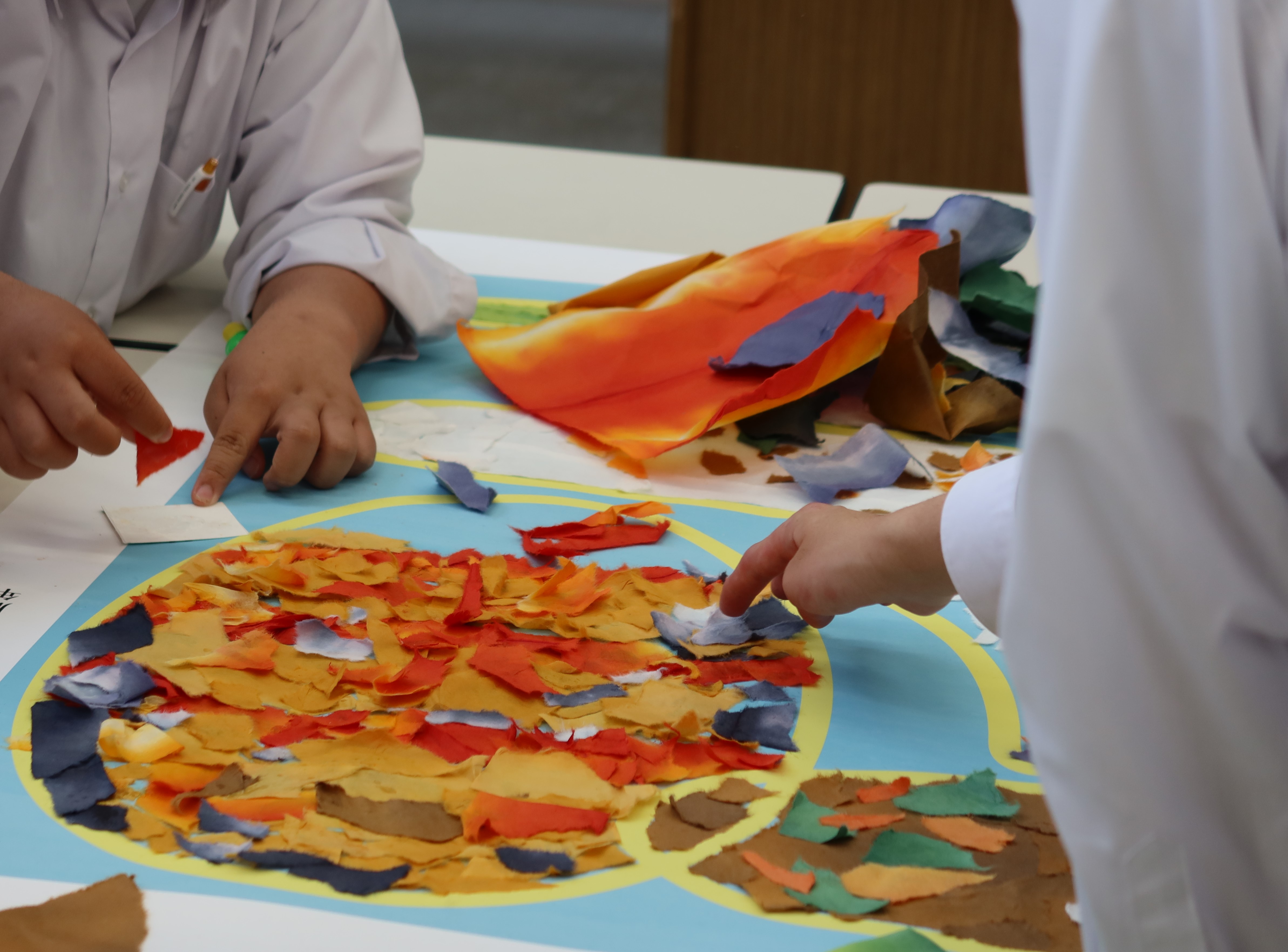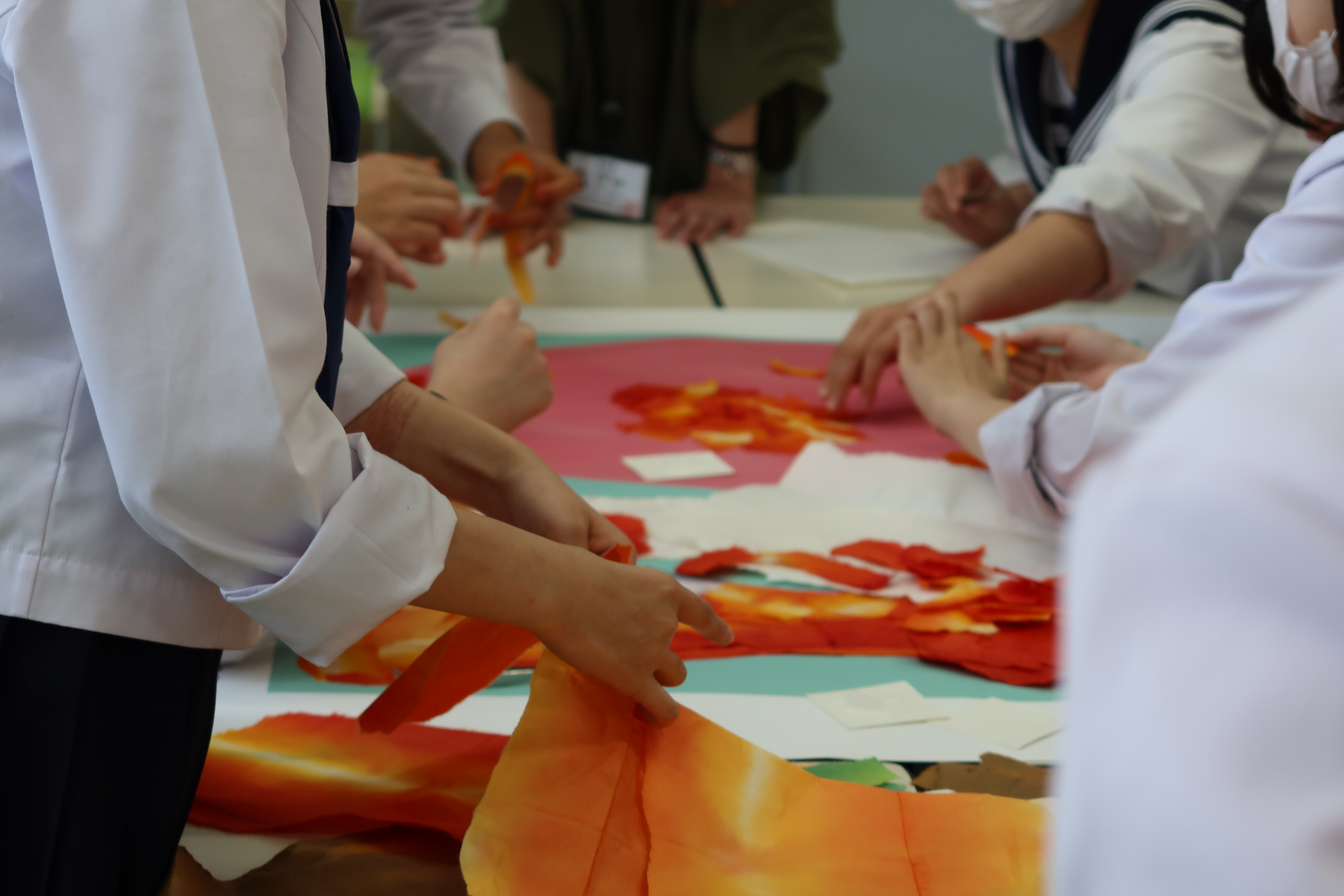 生徒の皆さんは、ポスターに描かれたモチーフの説明を受けた後、2つのチームに分かれて和紙を切り貼りし、制作しました。友達同士でモチーフに対するイメージを出し合い、それぞれのチームで協力しながら制作を進めていきました。