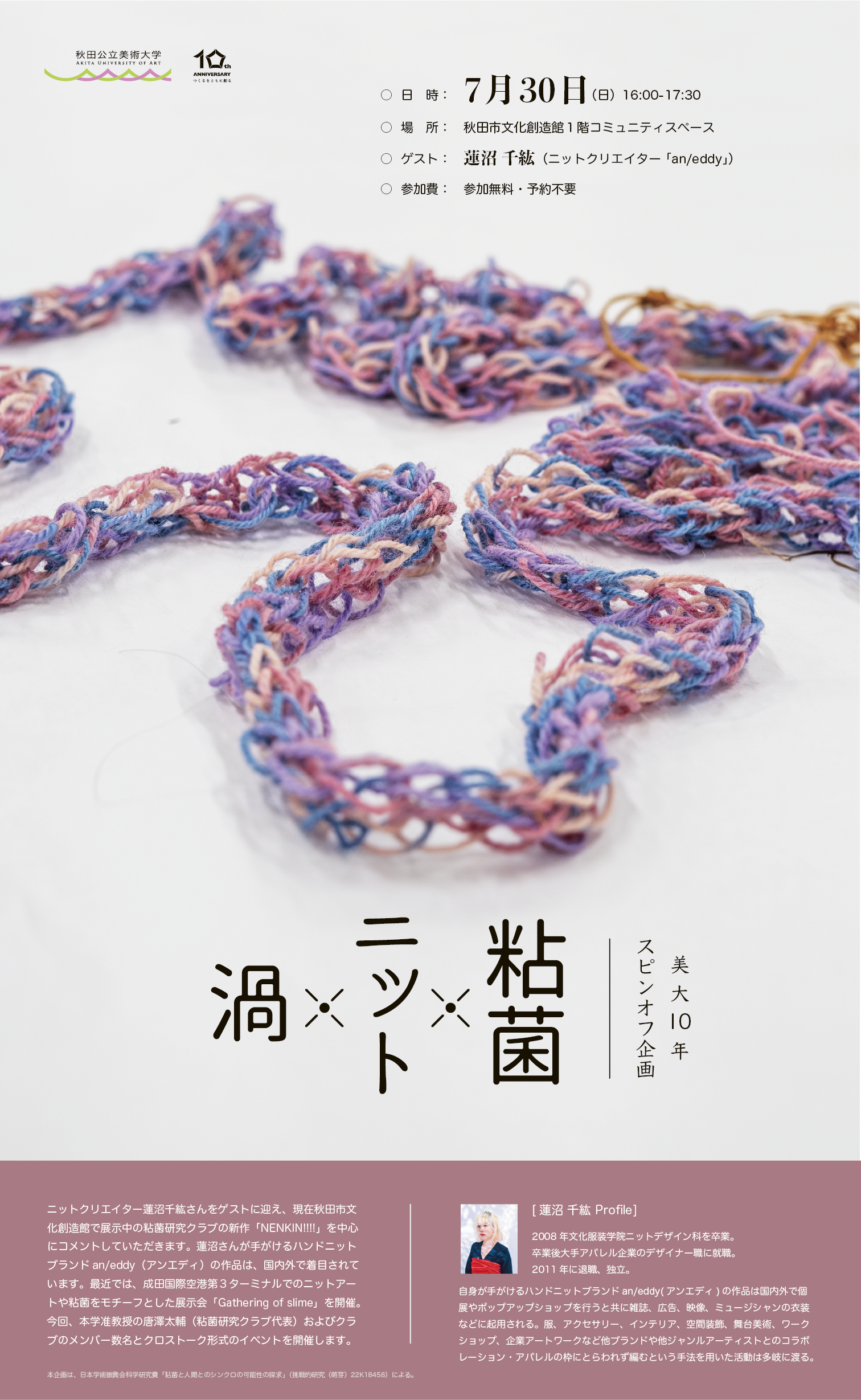 ニットクリエイター蓮沼千紘さんをゲストに迎え、秋田市文化創造館で展示中の粘菌研究クラブの新作「NENKIN!!!!」を中心にコメントしていただきます。蓮沼さんが手がけるハンドニットブランドan/eddy(アンエディ)の作品は、国内外で着目されています。最近では、成田国際空港第3ターミナルでのニットアートや粘菌をモチーフとした展示会「Gathering of slime」を開催。今回、本学大学院複合芸術研究科の唐澤太輔准教授(粘菌研究クラブ代表)およびクラブのメンバー数名とクロストーク形式のイベントを開催します。