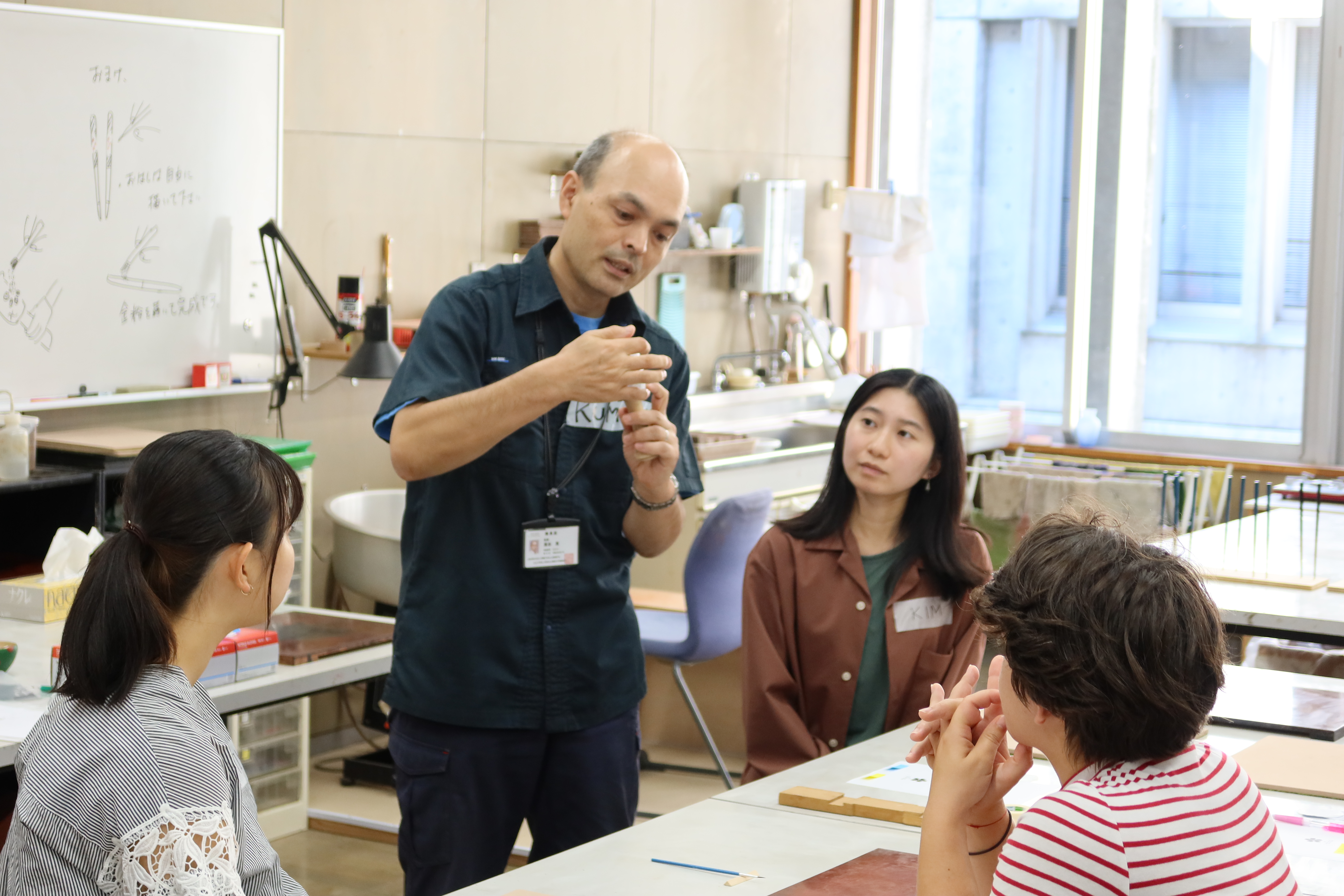 向かい合った学生は互いに自己紹介をし、程よい緊張感のなかスタートしました。はじめに、ものづくりデザイン専攻の熊谷晃教授から蒔絵の技法について説明を受けた後、酒器の制作を進めました。