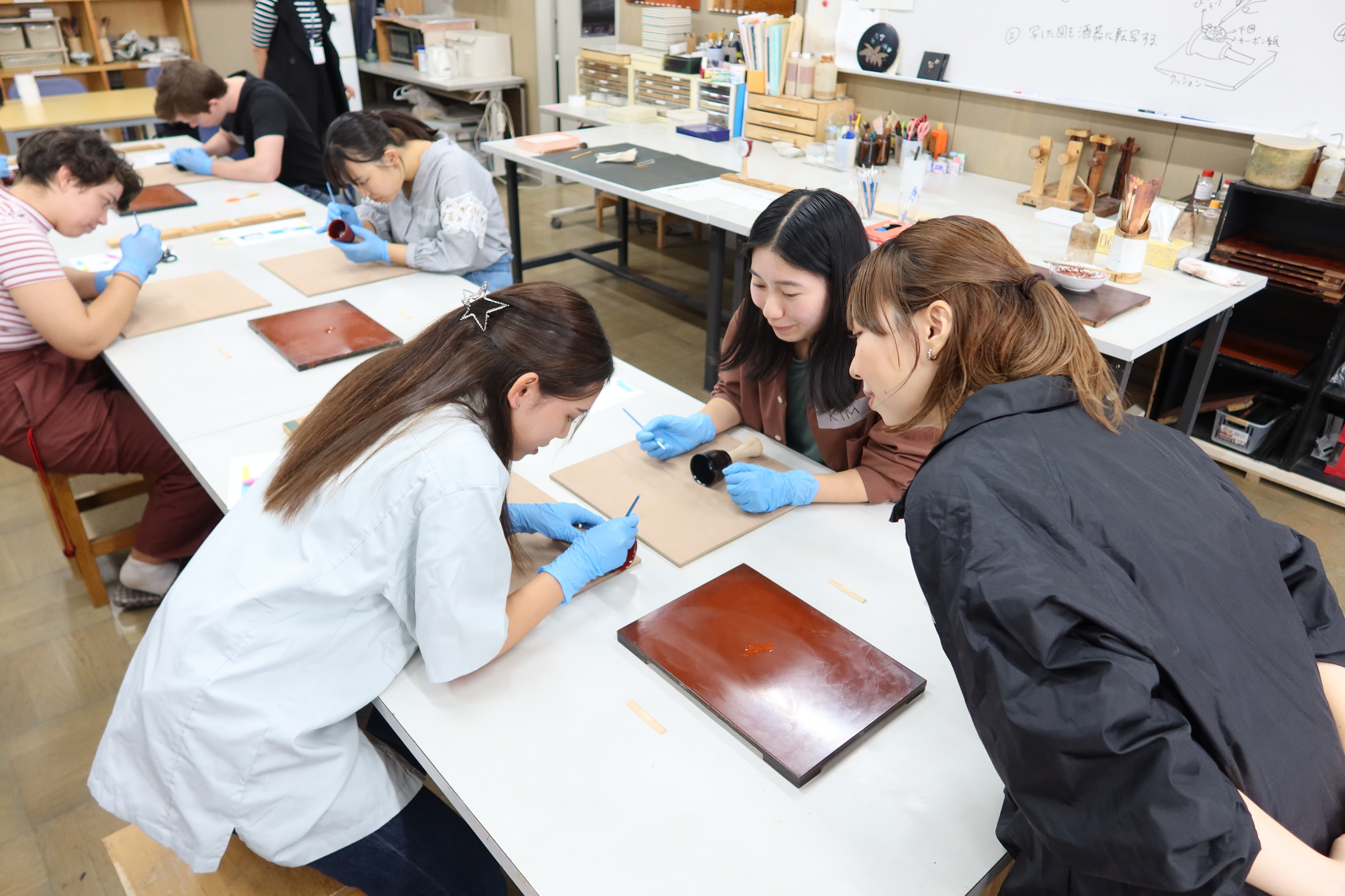 9月22日(金)、本学を会場に国際教養大学の留学生との「蒔絵体験」を実施しました。今回は国際教養大学から6名の外国人留学生を迎えての開催となりました。異なる領域を学ぶ学生との交流に加え、言語を含めた異文化交流の機会となりました。