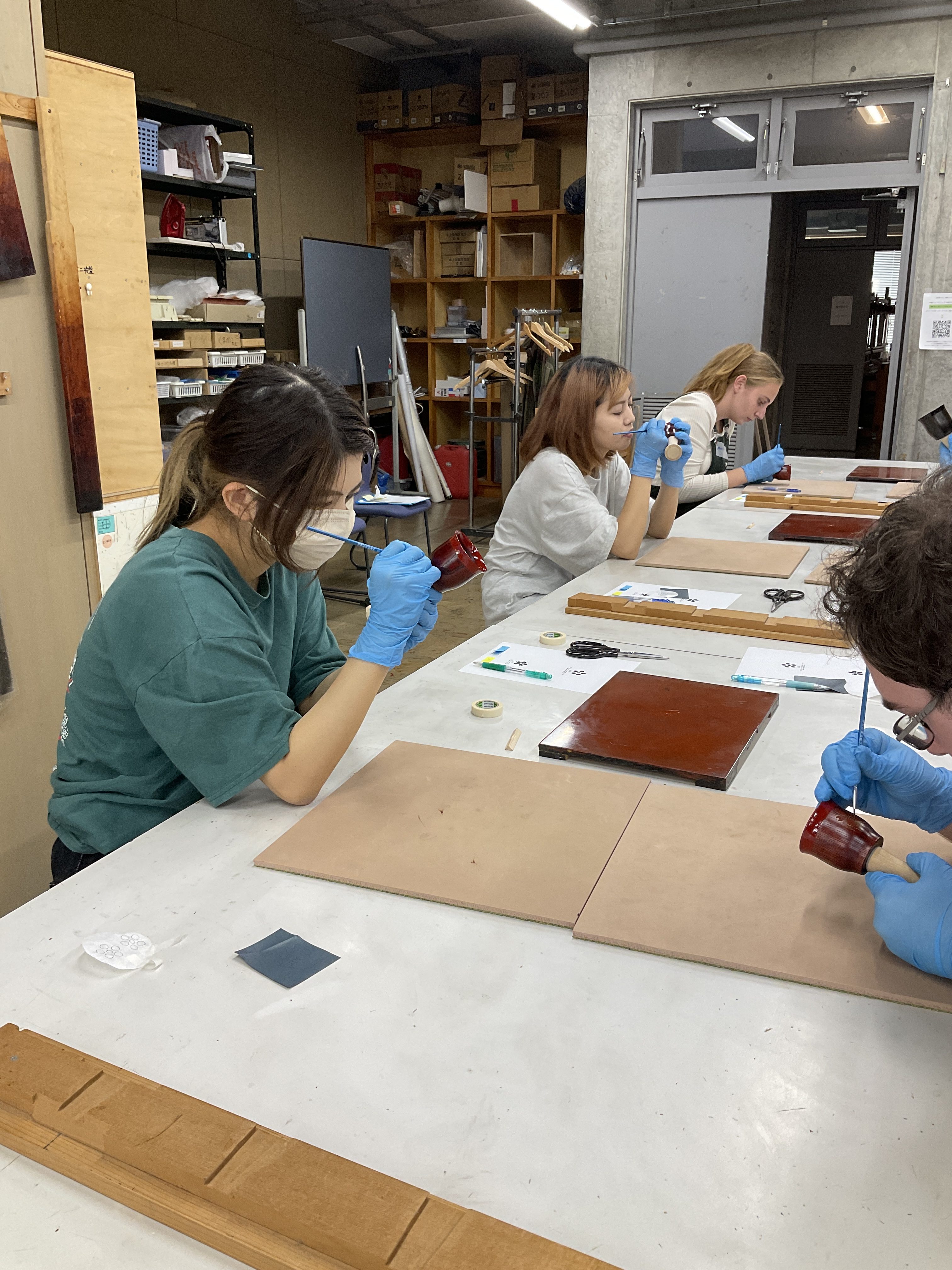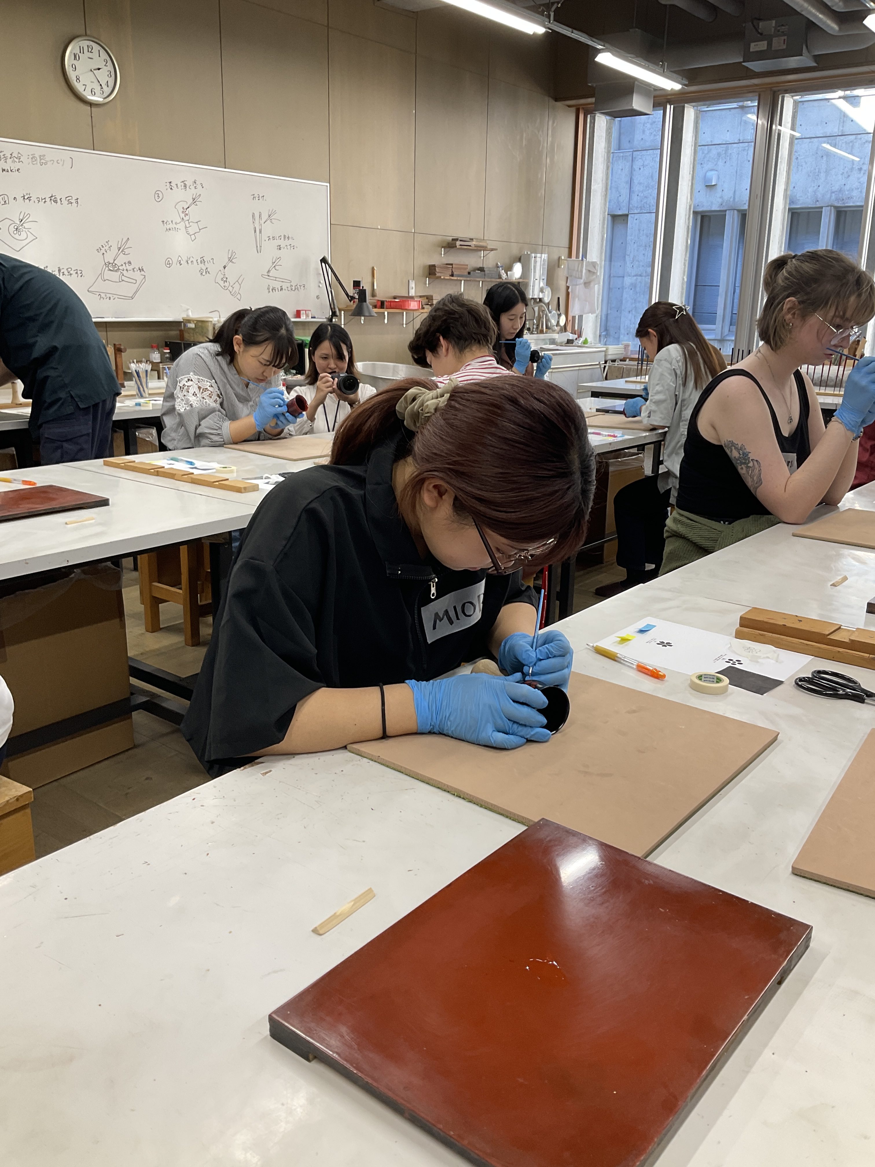 デザインを描き終えたら漆を塗った部分に金粉を蒔いていきます(粉蒔)。描いたデザインが崩れないよう余分な金粉を払う作業は、先生にサポートしてもらいながら最後の仕上げをします。デザインを描き終え、粉蒔の工程を待つ学生たちが集まり、交流を深めていました。