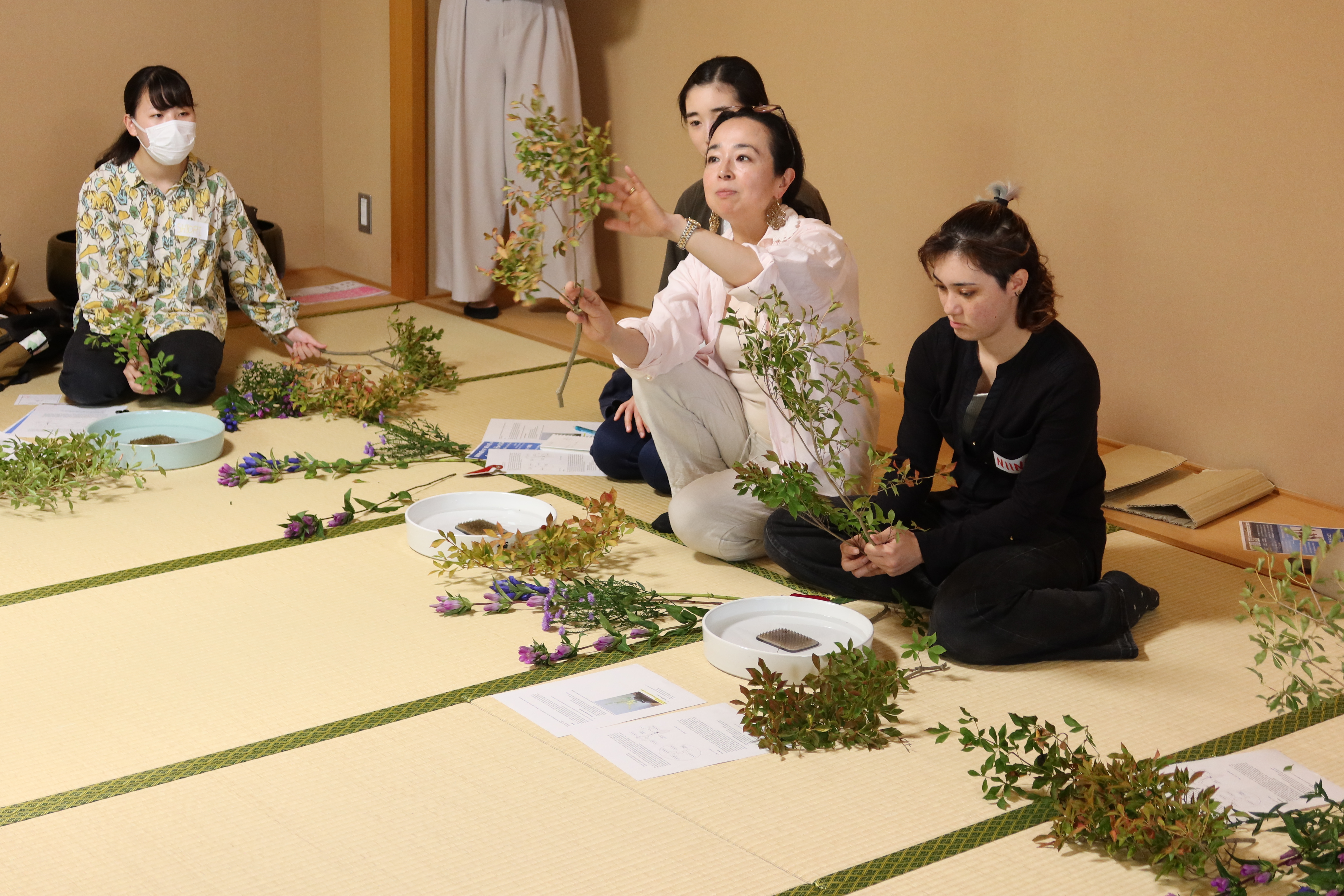 学生たちは、簡単な自己紹介をした後に、講師の千葉加恵子准教授(国際教養大学グローバル・コネクティビティ領域)から、セットされた花器と草花の紹介など花生けの基本について学びました。