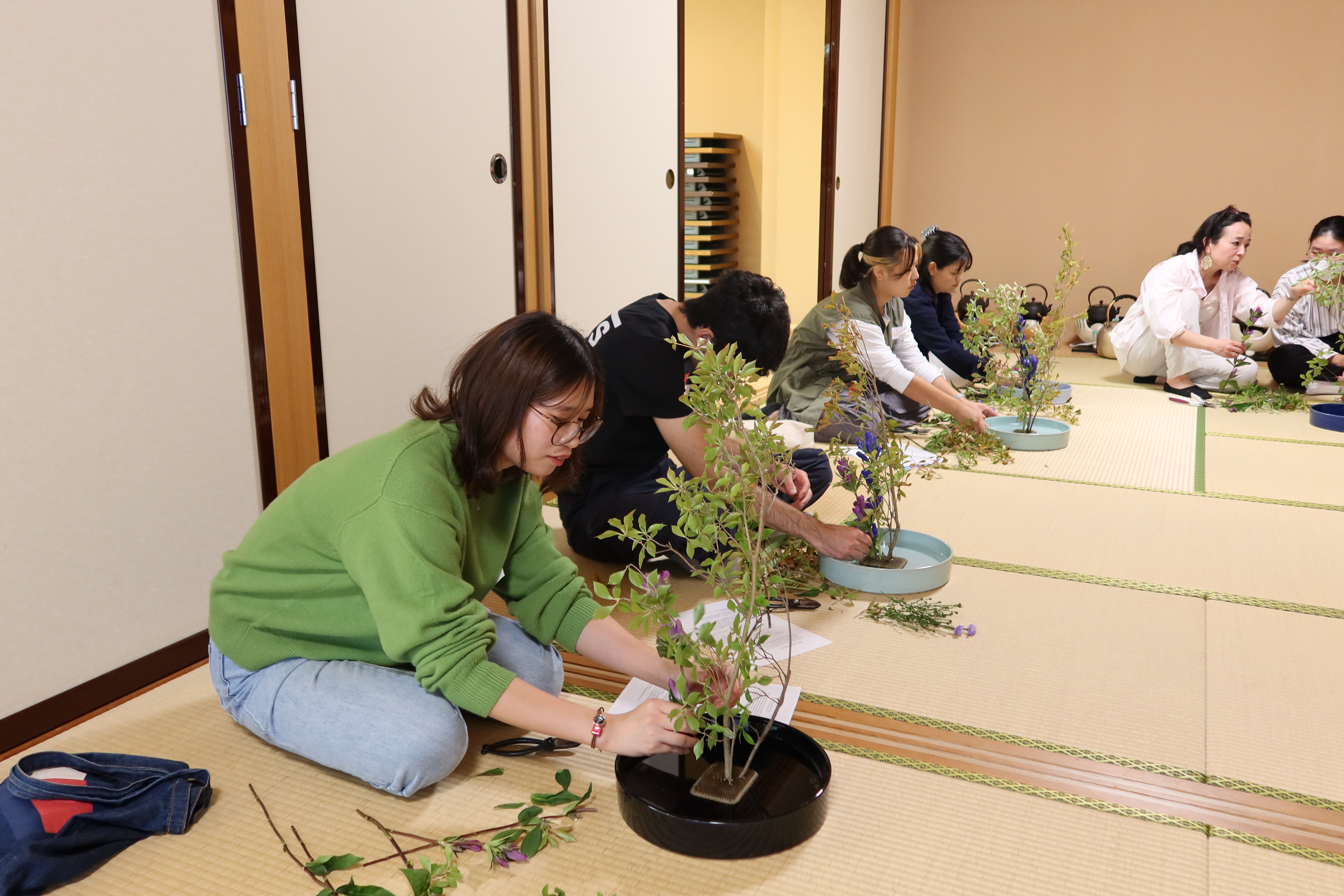 1時間という短い時間でしたが、各々が草花の個性や特徴を見つけ、思い思いが描く形で生け花を完成することができました。また、学生同士で生け方を確認したり、教え合いながら交流を深めていました。