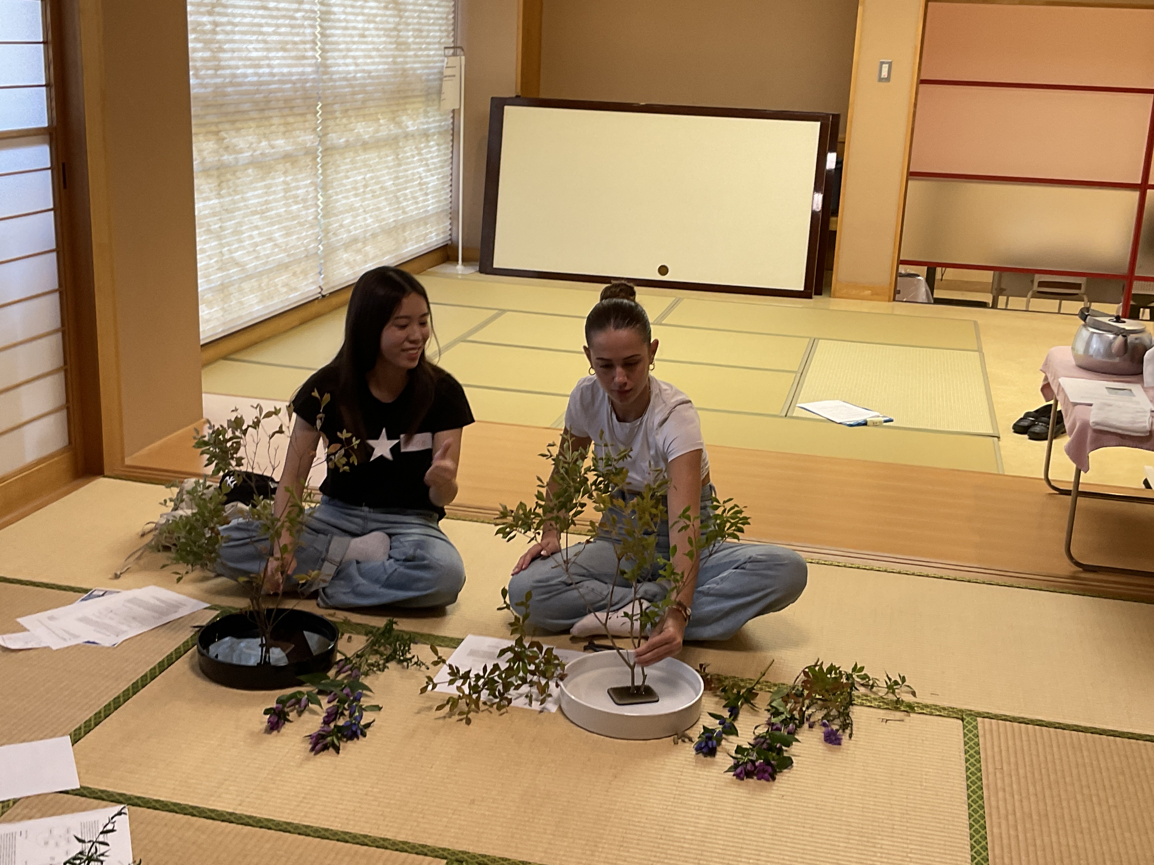 「主位・副位・客位」といった生け花の基本の用語やルールの説明の後、学生達は目の前にセットされた草花を手に取り、大きさやバランスをみながら、枝葉を切ったり広げたりして、草花の個性や特徴を引き出そうとペアとなった学生同士で話し合いながら進めていきました。