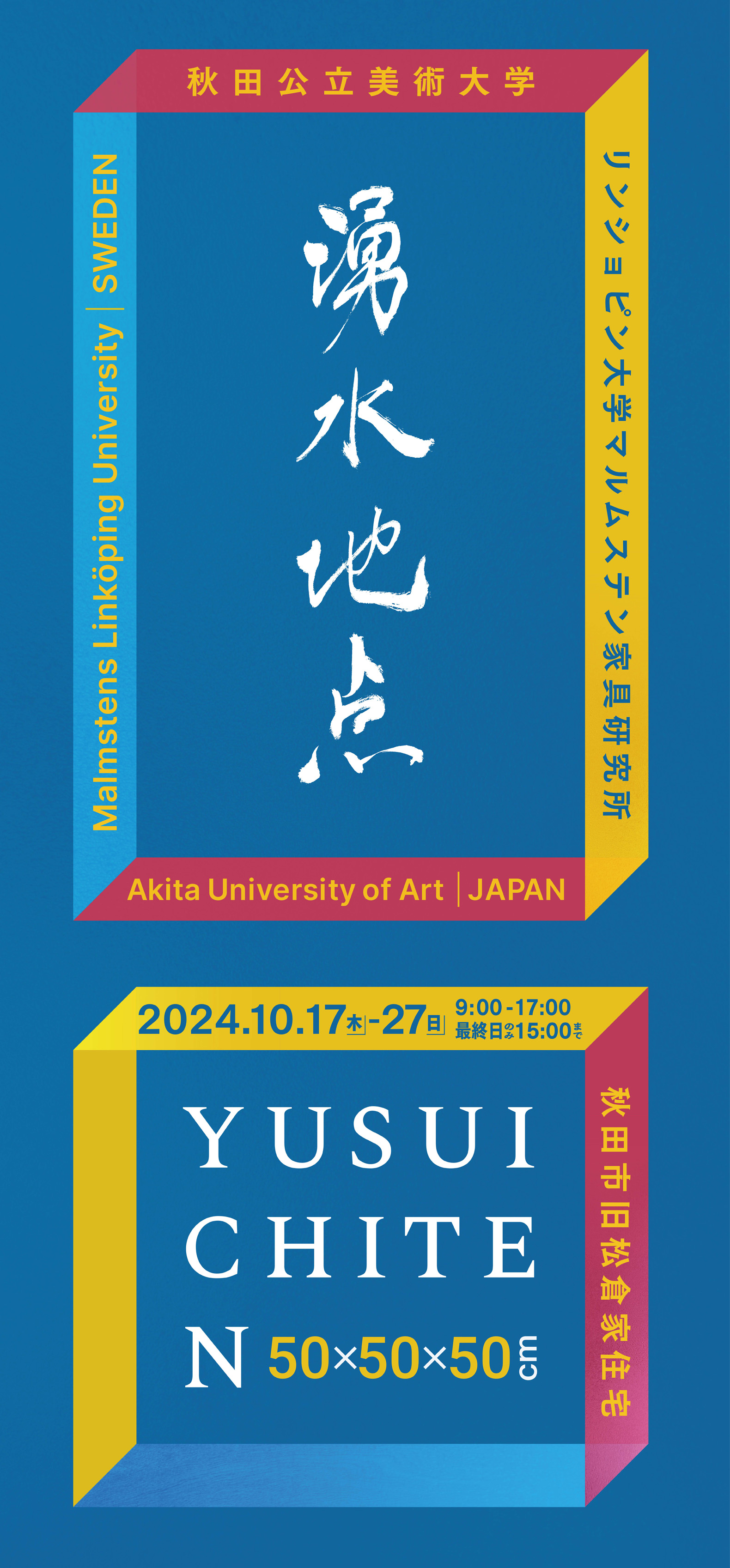 今年度は、国際交流協定締結校であるスウェーデンのリンショピン大学マルムステン家具研究所との初のコラボレーションとして、両大学の教職員が11チームを組み、各チームが、「50×50×50㎝」というスケールをテーマに自由に表現した合同教員展「湧水地点」を実施します。