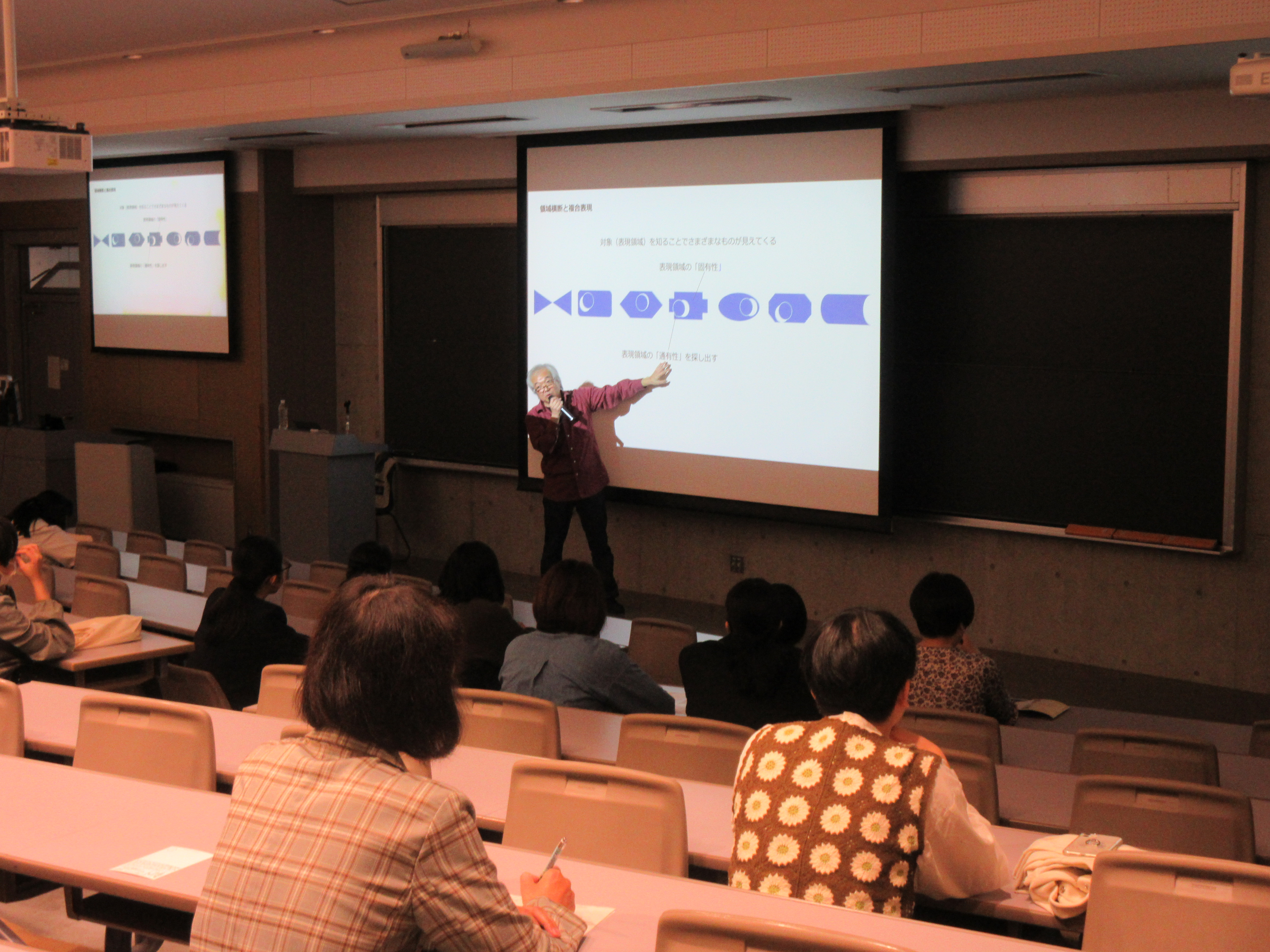 岩井教授は、「秋美の領域横断」というテーマで、本学の理念である「新しい芸術領域の創造」について、実現のために必要な領域横断の視野、その方法論として掲げている複合芸術について解説しました。