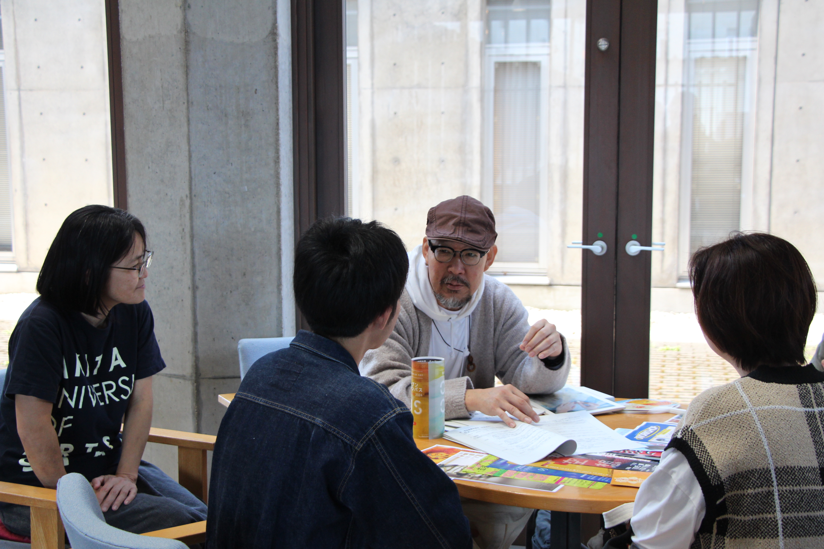 教員によるトークイベントでは、アーツ&ルーツ専攻の藤浩志教授と、ビジュアルアーツ専攻の岩井成昭教授が登壇しました。