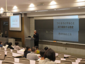 藤教授は、「美大のすすめ」と題して、美大に対しての誤解と、これからの時代に必要な生きるための技術、方法、学びについて講演しました。