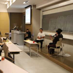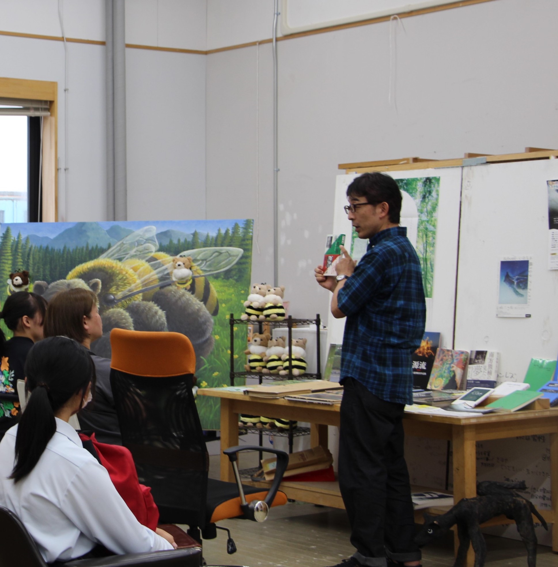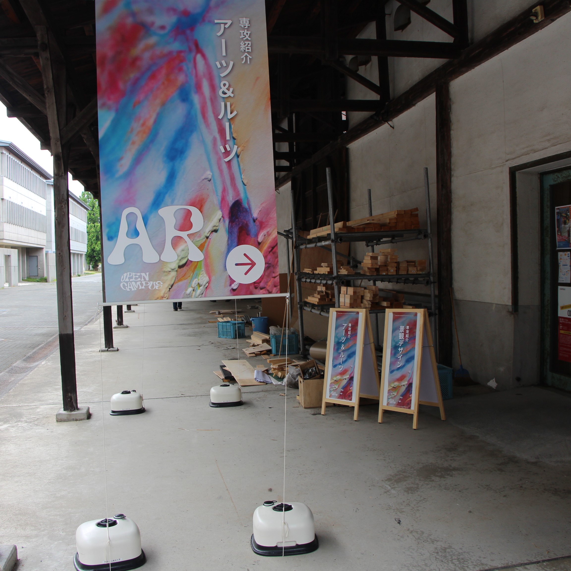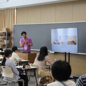 「専攻紹介タイム」には、3年次から配属となる5専攻について、各専攻の活動を所属の学生や教員が紹介しました。実習棟や工房などに集まった参加者は実際の作品を見ながら興味深く話を聞いている様子でした。