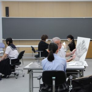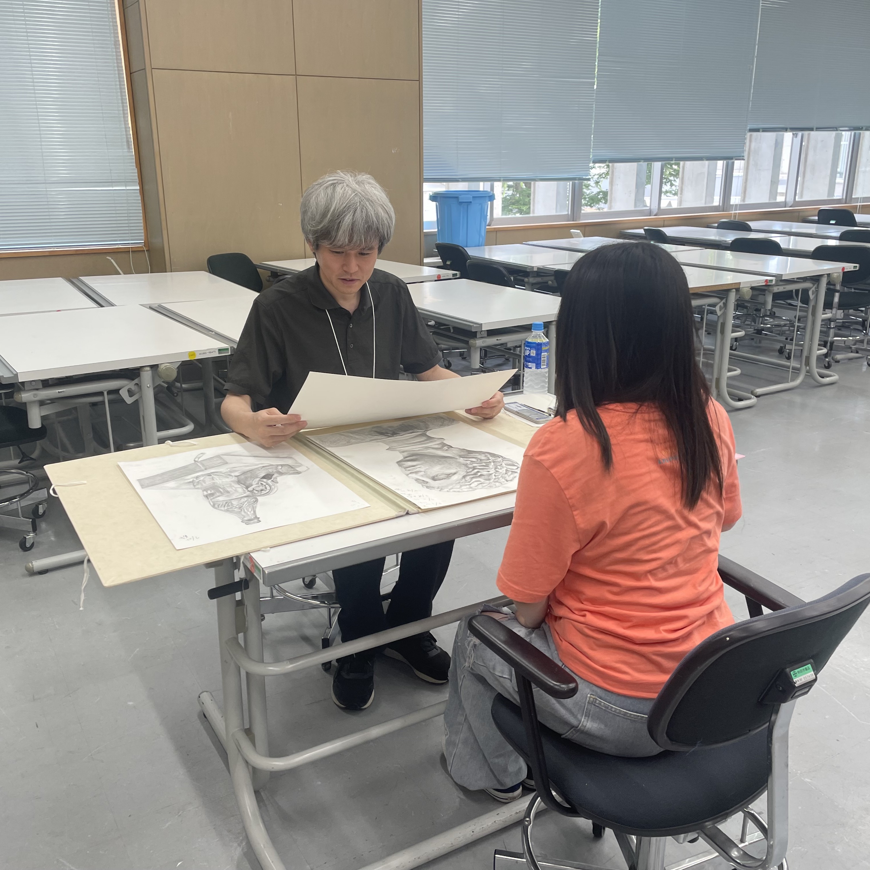 「持込デッサン指導」では、自身のスキルアップのため、参加者は、教員からのアドバイスに熱心に耳を傾けていました。