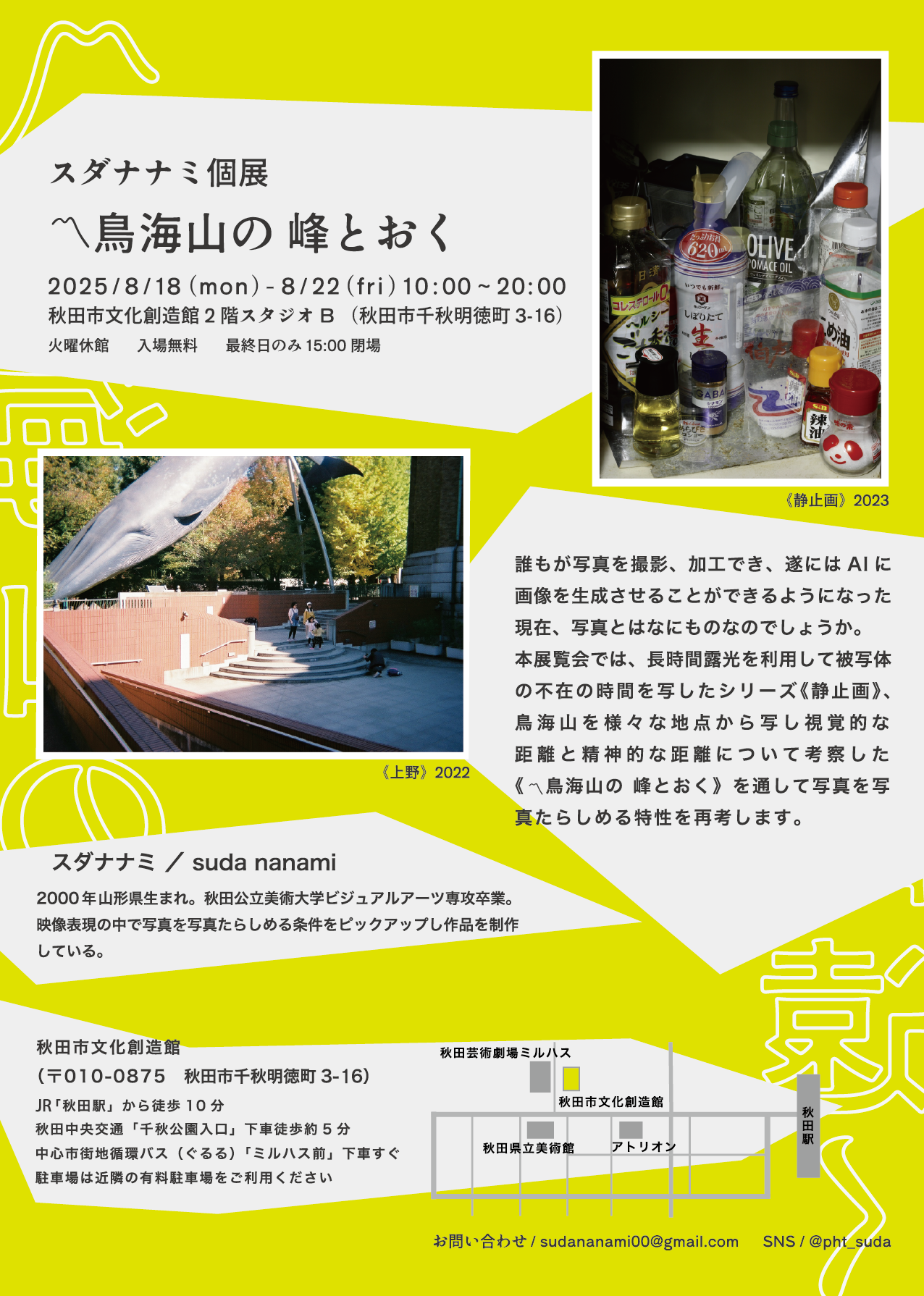 長時間露光を利用して被写体の不在の時間を写したシリーズ《静止画》、鳥海山を様々な地点から写し視覚的な距離と精神的な距離について考察した《〽鳥海山の 峰とおく》を通して写真を写真たらしめる特性について再考します。