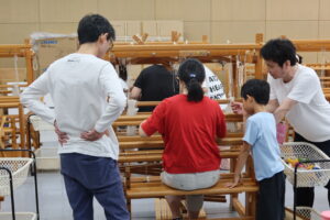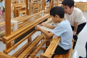 最初のうちは手順を一つ一つ確認しながらのぎこちない動きでしたが、あっという間に慣れて、次々と織っていきます。お子様が織った後は、保護者様にバトンタッチ。“織りの先輩”であるお子様からのご指導を受けながら、保護者様も丁寧に綿の糸を織り上げていきます。
