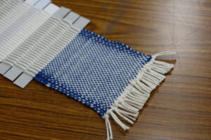 手織機を使い、平織りの技法で10㎝四方のコースターを作ります。