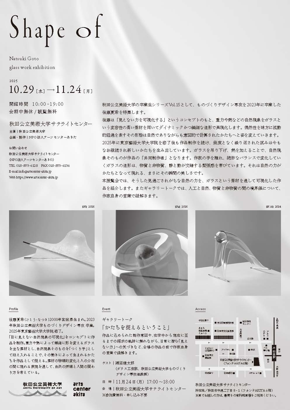 秋田公立美術大学の卒業生シリーズVol.15として、後藤夏希さん(2023年ものづくりデザイン専攻卒業)の展覧会「『Shape of 』Natsuki Goto glass work exhibition」を開催します。11月24日(月・振休)には、ギャラリートークも開催しますので、ぜひお越しください。