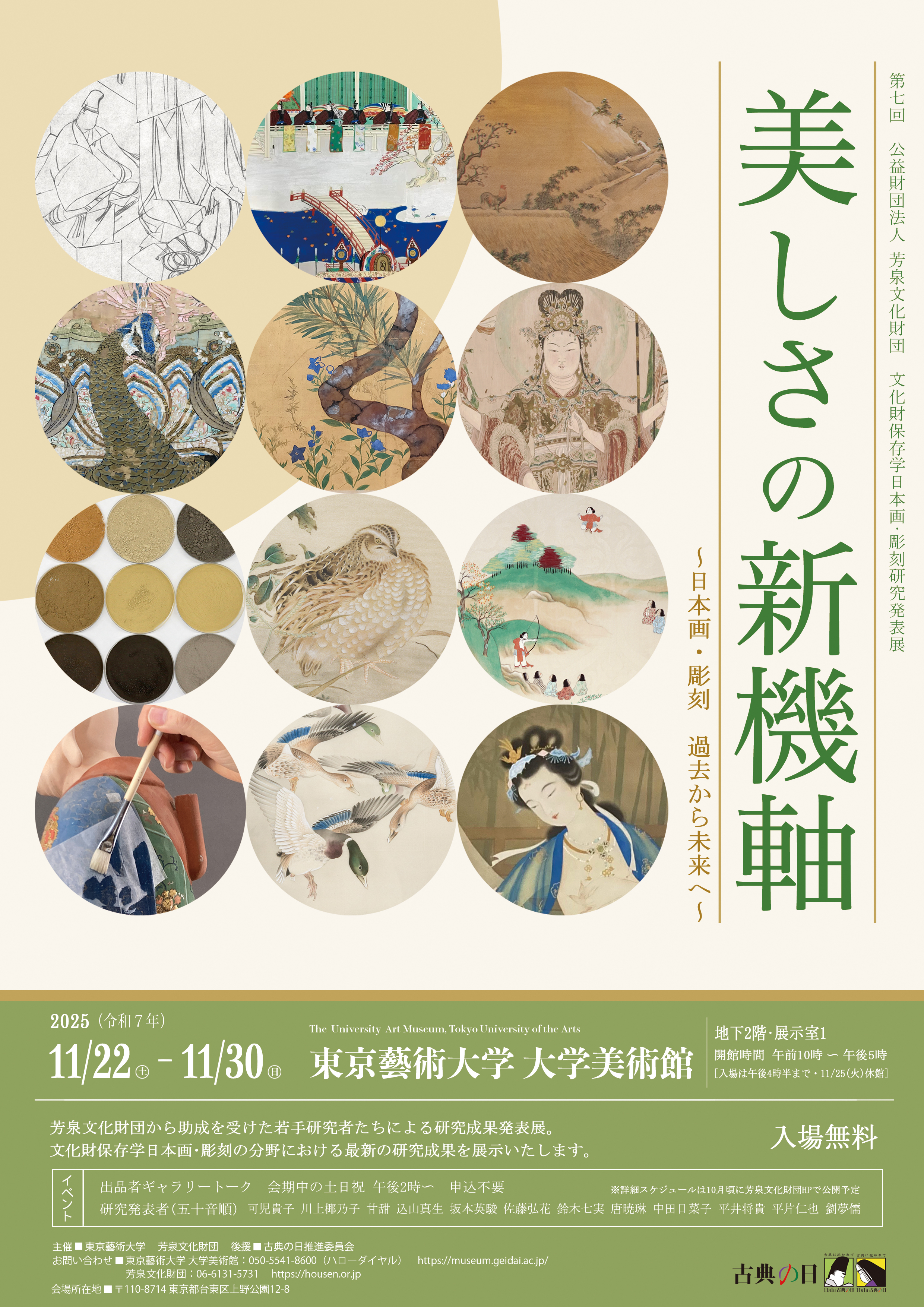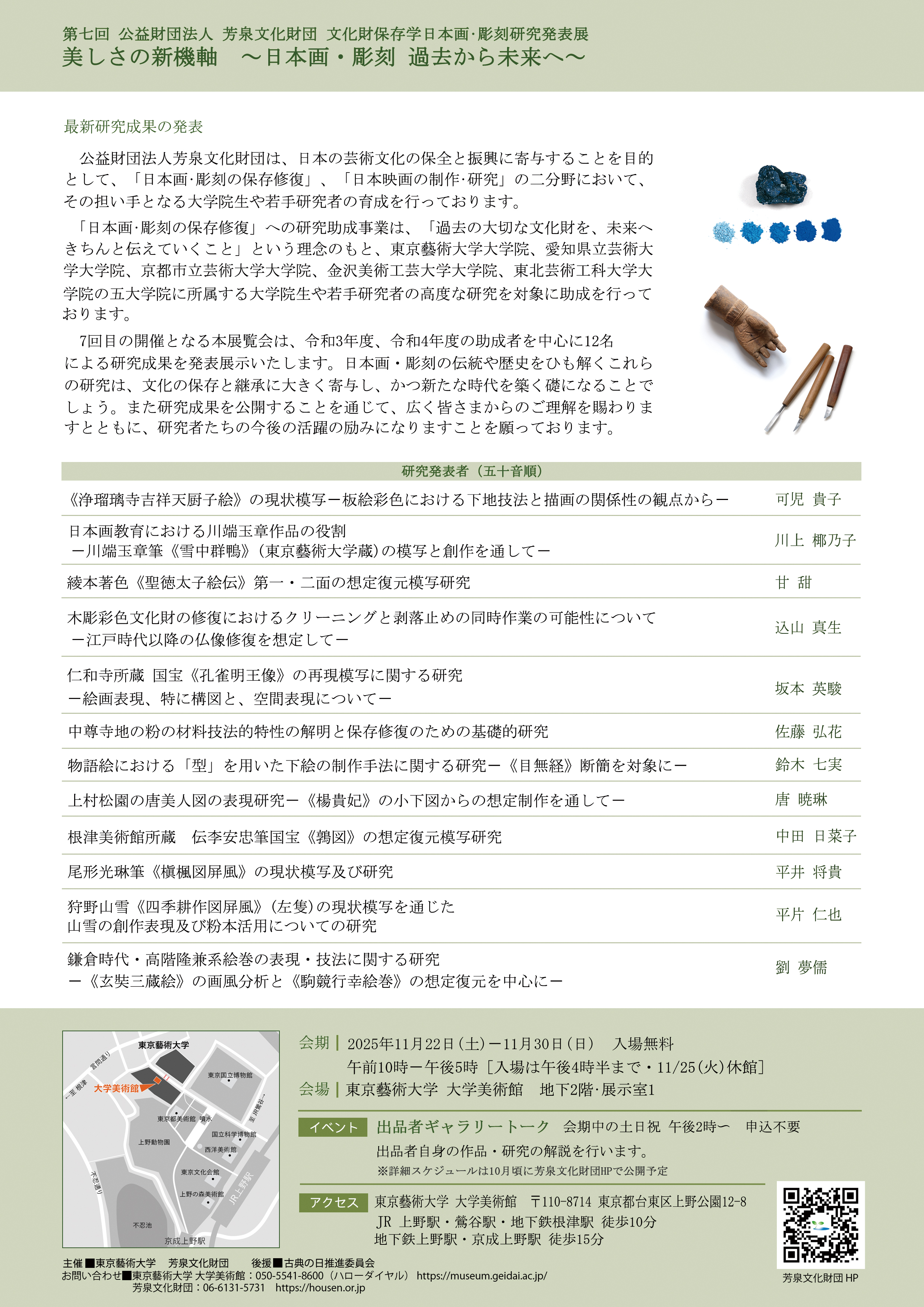 本展覧会は、日本画・彫刻助成事業の一環として、芳泉文化財団から助成を受けた文化財保存学「日本画・彫刻」の研究成果を発表するものであり、今回で7回目を迎えます。