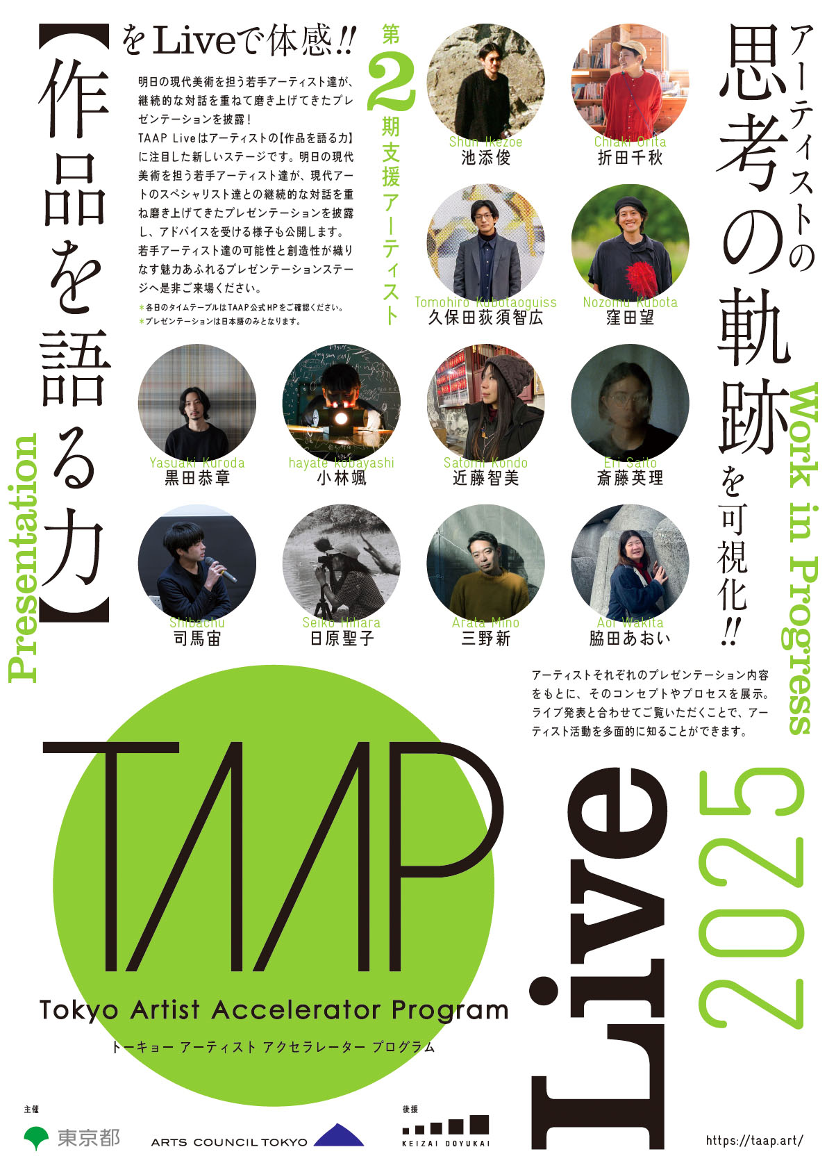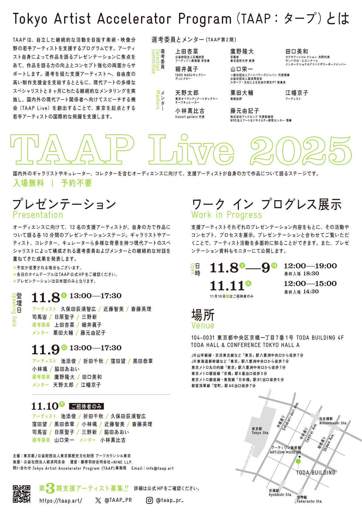 本学景観デザイン専攻の折田千秋助手が、東京都で開催される「Tokyo Artist Accelerator Program(TAAP) Live 2025」に登壇し、プレゼンテーションと展示を行います。