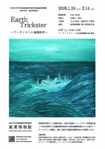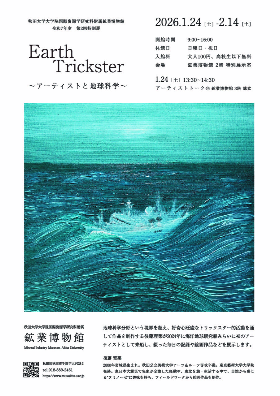 本学卒業生の後藤理菜さん(2023年アーツ&ルーツ専攻卒業。現東京藝術大学大学院)が、秋田大学大学院国際資源学研究科附属鉱業博物館の令和7年度第2回特別展として、「Earth Trickster 〜アーティストと地球科学〜」展を開催します。