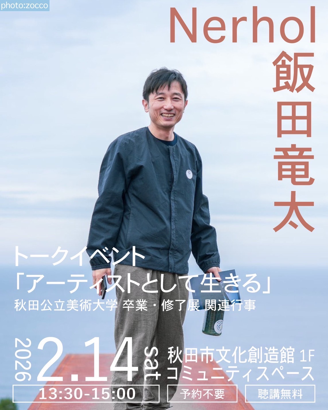 ビジュアルアーツ専攻では「秋田公立美術大学卒業・修了展2026」の関連行事としてアーティストデュオNerholの飯田竜太さんをお招きしトークイベント「アーティストとして生きる」を開催いたします。