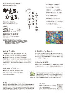 本学では、新しい美的価値の創造や思想的潮流を生み出すことを目的に掲げる芸術表現企画事業として、今年度は人の手によって作られてきたモノ・コトの循環とその終わり方、見送り方、残り方について探るプロジェクト型事業「Project Goodbye」を実施しており、その成果となる関連企画として、展示会「かえる、かえる。」を開催いたします。