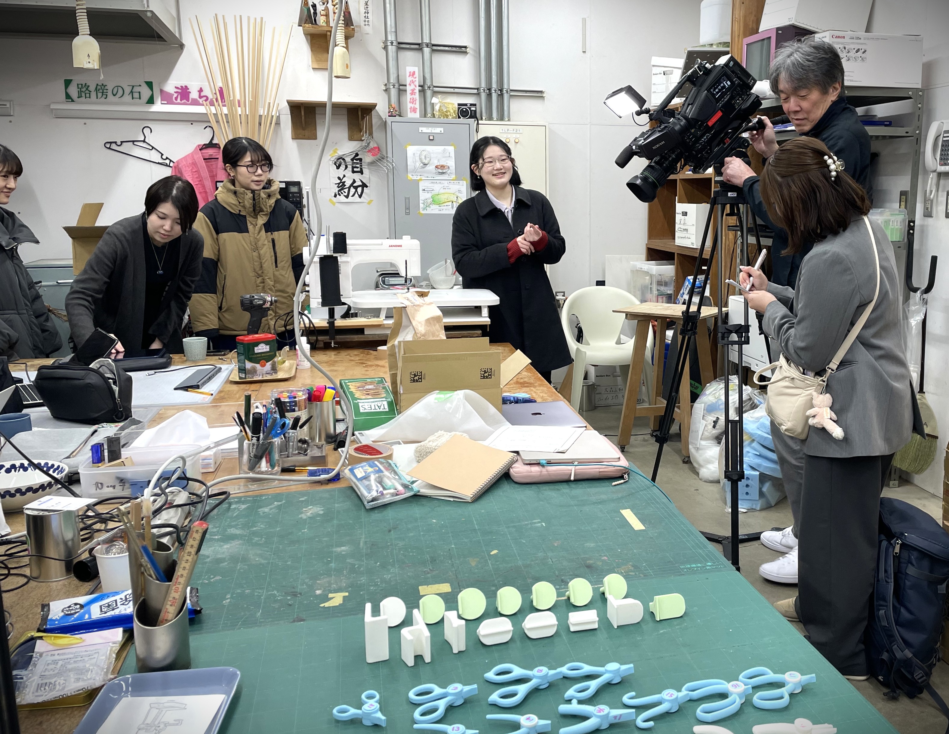 本学の「ものづくりデザイン演習2(プロダクトデザインA)」を履修している学生の授業成果が、各報道機関から取材を受けました。インタビューの中で、学生は作品制作における試行錯誤の過程や、完成までの苦労について語りました。